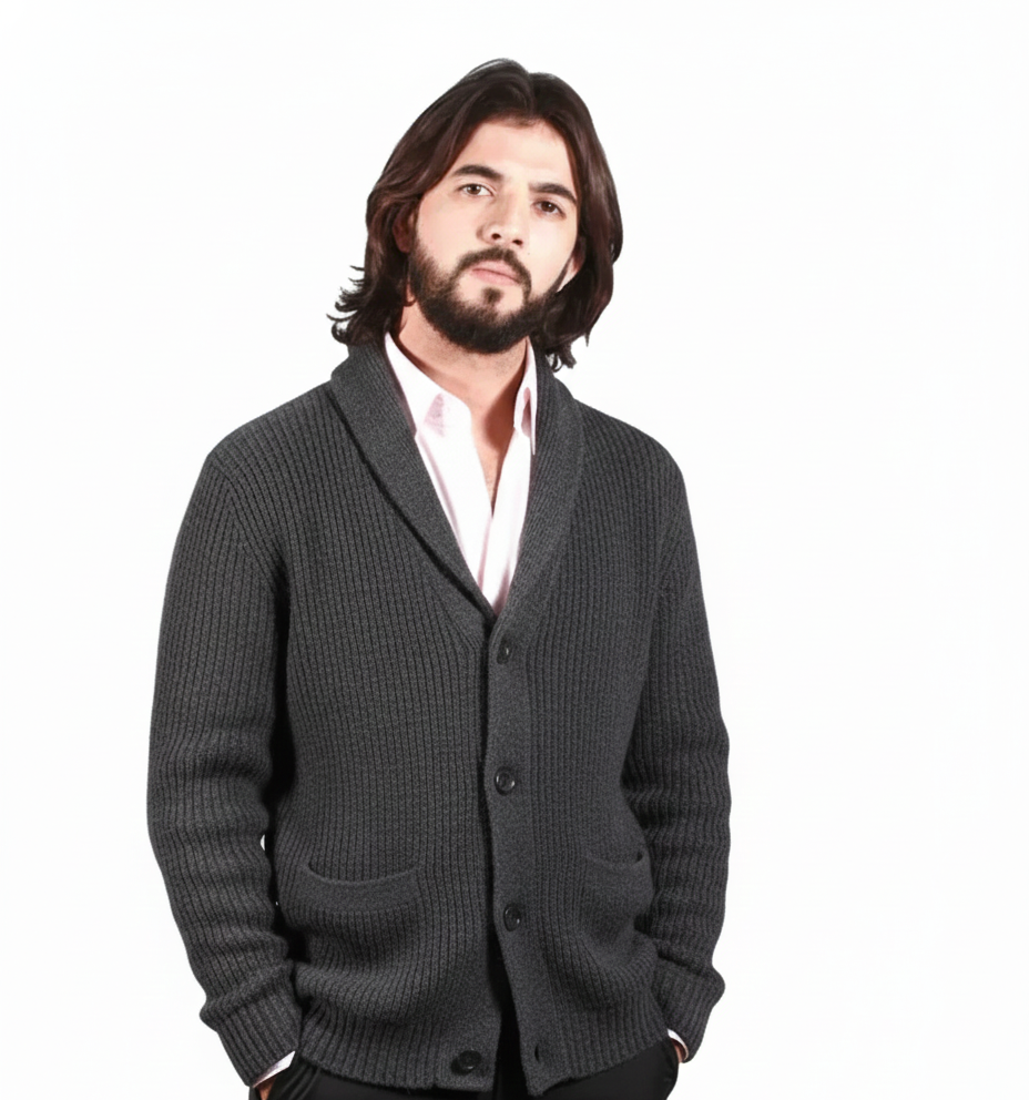 Ce modèle se distingue par sa maille douce, son col châle sophistiqué et ses poches pratiques à l’avant.